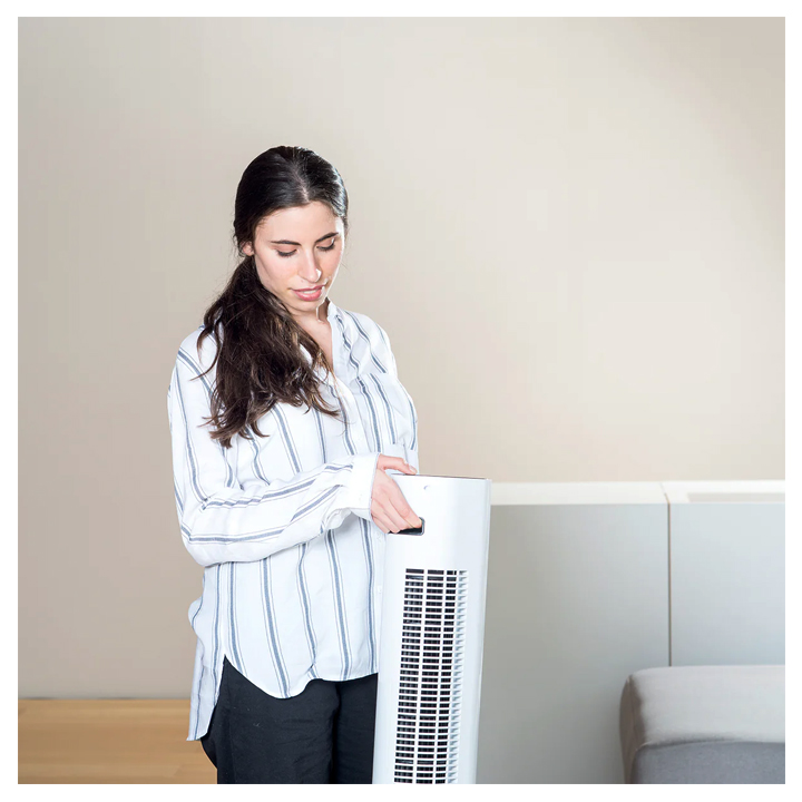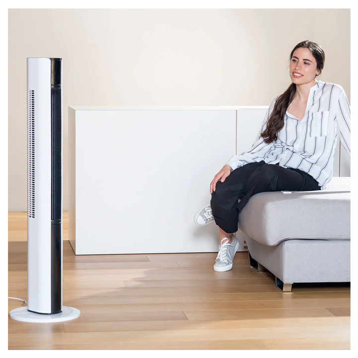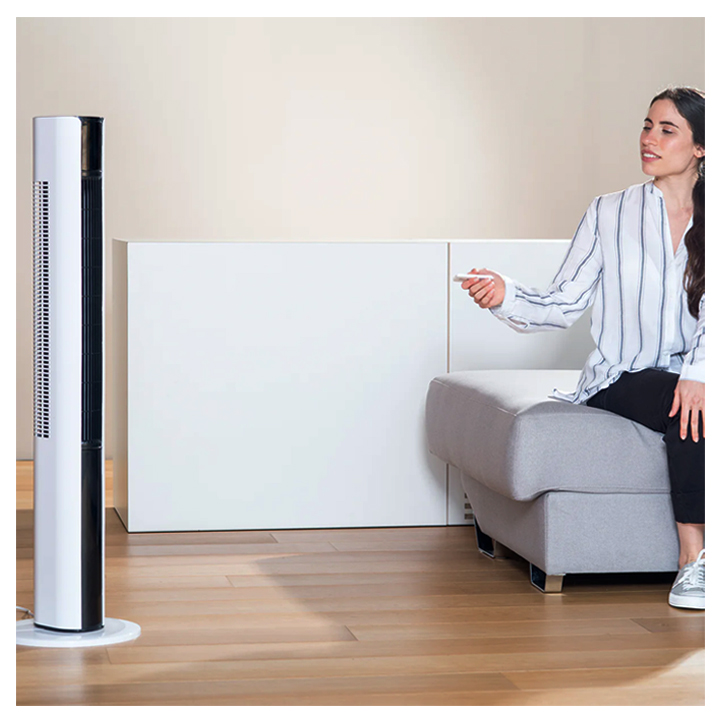 Ventilador de torre Taurus Babel Infinite . El ventilador de torre Babel Infinite de Taurus ofrece 50W de potencia con 3 velocidades, 3 modos de ventilación (normal, brisa y noche) y temporizador de hasta 15 horas. Con 110 cm de altura, sistema de oscilación, mando a distancia y selector táctil, proporciona una ventilación eficiente, silenciosa y personalizada. Especificaciones: 50W de potencia, 3 velocidades, 3 modos: normal, brisa y noche, temporizador de 15h, 110 cm de altura, con sistema de oscilación y mando a distancia. Selector táctil y  asa de transporte. Base redonda y antideslizante. Ideal para estancias amplias que necesitan frescor duradero con un diseño elegante y funcional. ¡ Comodidad y estilo en cada rincón !. Ref: 24297.