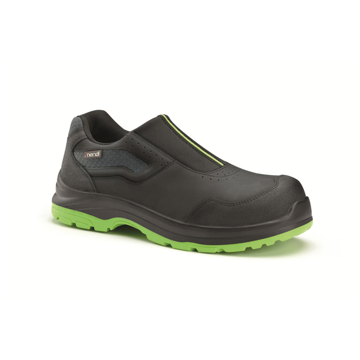 Zapato de seguridad Mendi Close O34W. Protección:  S3L+FO+CI+SR+ESD. Zapato sin cordones muy cómodo y flexible que se adapta al pie gracias al neopreno del empeine. Zapato sin cordones de piel flor lisa hidrofugada y textil en cuello, con material elástico de neopreno en la zona del empeine para una mejora adaptación al pie. Incorpora puntera de fibra de vidrio y plantilla antiperforación textil. Suela bicolor de fácil identificación, con grips antideslizantes y amplios canales de evacuación. Calzado ESD, resistencia eléctrica entre 0,1 y 100 Ohmnios. Banda trasera y cordones reflectantes para una mejor visibilidad. Refuerzo de sujección del pie en zona de talón. Refuerzo de la suela en puntera y talón. Ref: O34W.