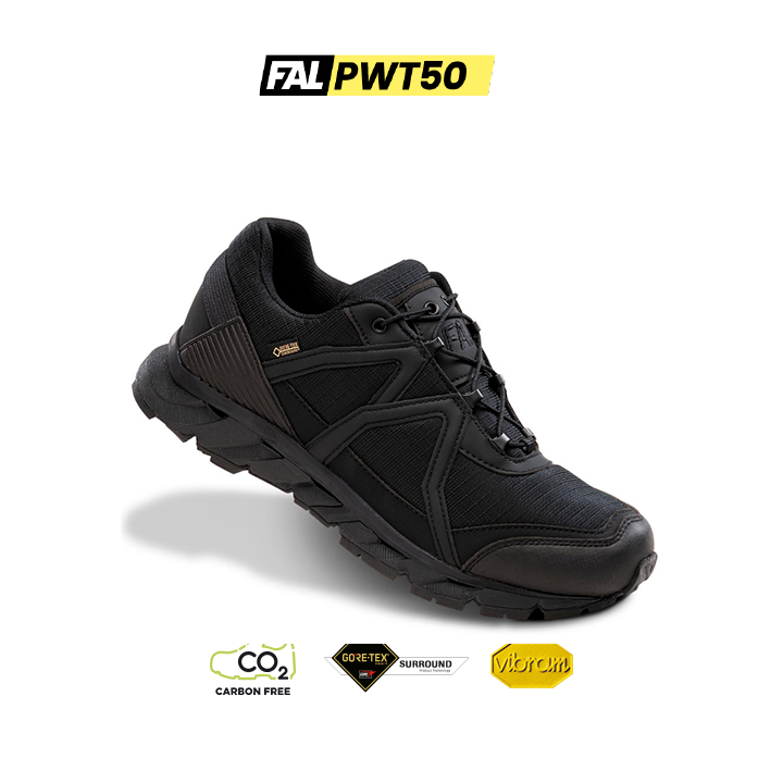 Zapato Power Tech Range FAL PWT50 OB+SR+HRO+E+WPA+WR, zapato de material textil hidrofugado. Forro Gore-Tex con tecnología surround. Entresuela de phylon. Patín Vibram caucho, de caña baja o zapato de la línea Power Tech Range, diseñada para el máximo confort y rendimiento en entornos profesionales y tácticos. Ref:890103.